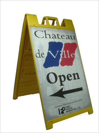 Durable plastic construction, ideal for outdoor use. Can be ballasted with sand, imprinted 4 color process 2 sides and LAMINATION STANDARD UV CLEAR MATTE or GLOSS. Made in USA Signcade is register trade mark.